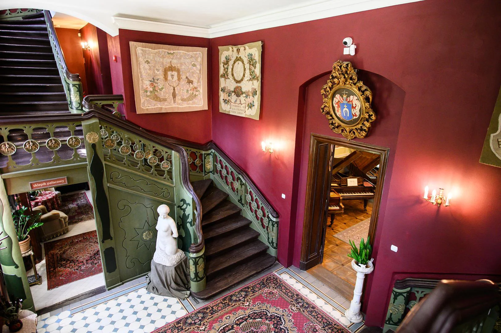 Pałac stary, na samym środku, tuż nad wejściem do pomieszczenia ekspozycyjnego, w bogato zdobionym kartuszu znajduje się herb Dołęga rodu Mostowskich. Obok herbu Gobeliny, przedstawiający herby rycerskich rodów zamieszkujących Ostromecko, wcześniej Ostromeckich i Dorpowskich. Z parteru na półpiętro prowadzą symetryczne, oryginalne 200-letnie biegi schodowe, usytuowane w dwóch przeciwległych narożnikach holu wejściowego. Pnące się wyżej jako symetryczne klatki schodowe wiodące na wyższe piętra. Niegdyś w Starym pałacu odbywały się pikniki kończące polowania, dlatego nazywano go również myśliwskim. Od 2011 roku znajduje się tutaj kolekcja zabytkowych fortepianów im. Andrzeja Szwalbego, jedna z trzech największych tego typu kolekcji w Polsce. Znajdziemy tu prawie wszystkie formy fortepianów z XIX i pierwszej połowy XX wieku. Skrzydłowe, stołowe, pionowe oraz formy mieszane, czyli hybrydy, a w ich wnętrzach niemal wszystkie typy mechaniki, rejestrów brzmieniowych czy zdobień.